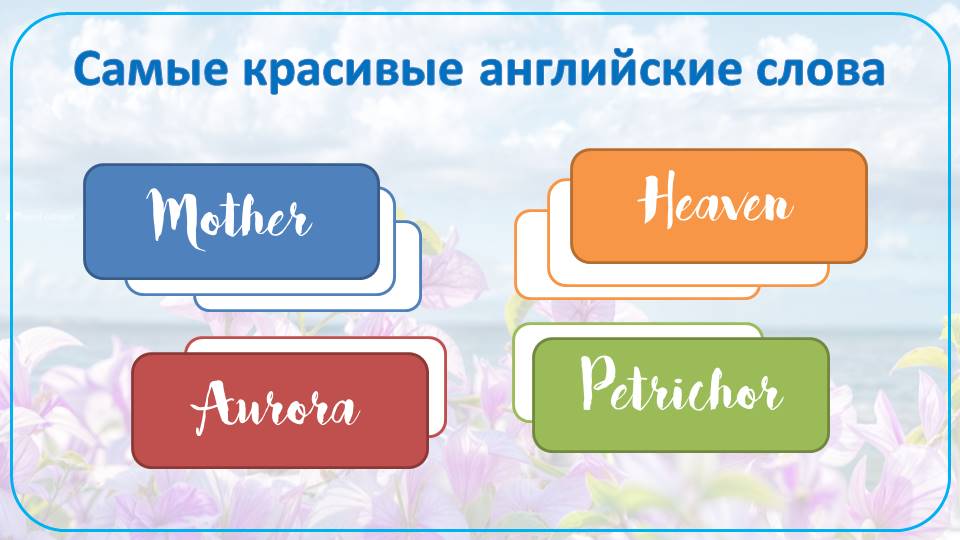 Возможно, найдутся люди, настроенные скептически по поводу этой заметки. Конечно, будут те, которые скажут, что, сколько людей, столько мнений. И, все же, не раз проводились исследования, которые выделяли несколько наиболее красиво звучащих и вызывающих добрые и яркие эмоции слов.
